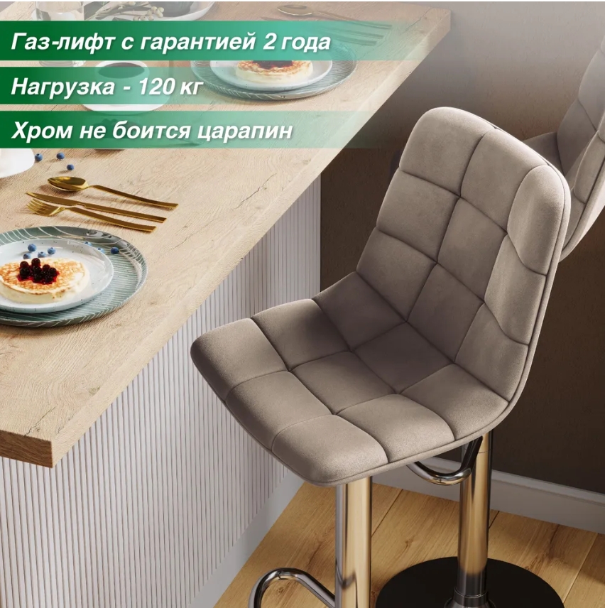 И это всё то же мягкое сиденье Чили с обивкой из премиум-велюра. Износостойкий (45 тысяч циклов по Мартиндейлу на износ), бархатный и приятный на ощупь, он разительно контрастирует с искусственной кожей, которая так популярна в барных стульях. При этом в практичности наш велюр не уступает экокоже. Любое загрязнение легко очищается влажной тряпочкой в мыльном растворе.